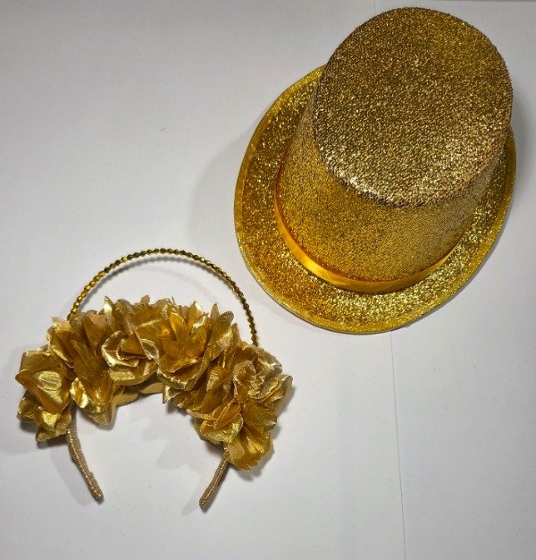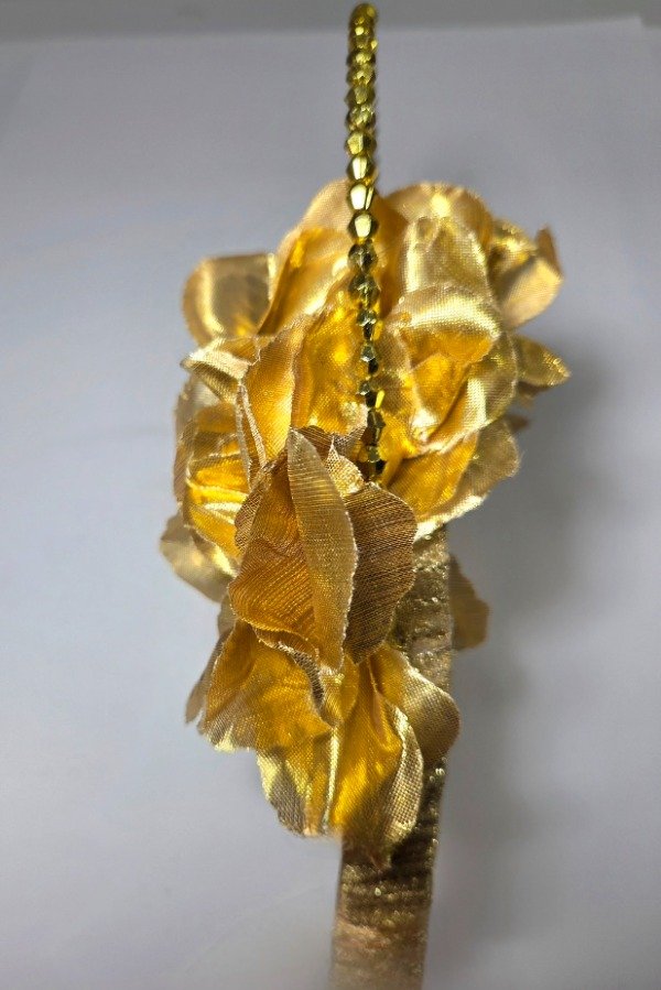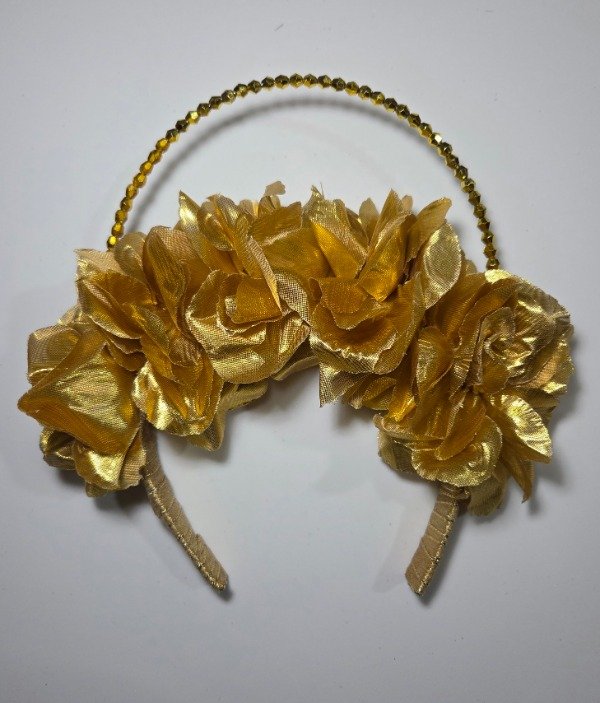 Vincha plastica forrada en cinta lurex dorada, 6 flores doradas cosidas a la base y halo metalico rigido, de perlas facetadas doradas