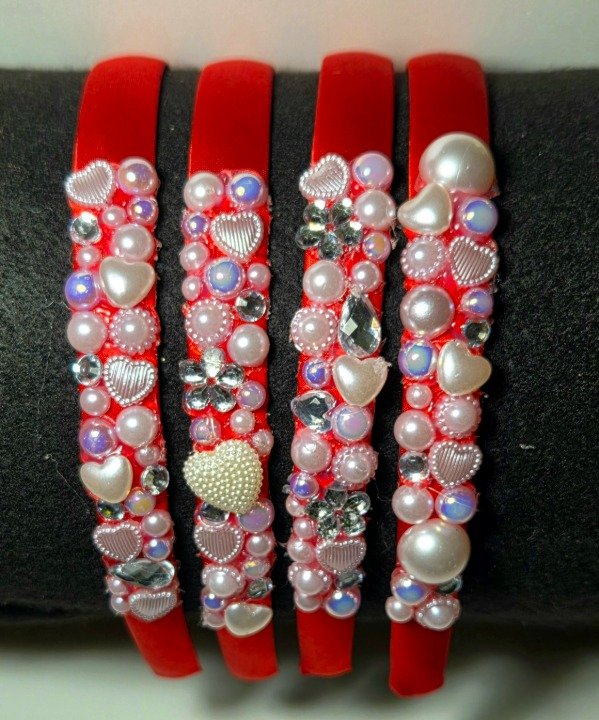 Vincha plastica (2 cm.) forrada en raso rojo, con aplique de perlas en distintas formas y tonalidades. Ideal para regalar en estas fiestas. Tanto para adultos como niñas es muy vistosa y delicada. Consultame por otros colores o personalizados.