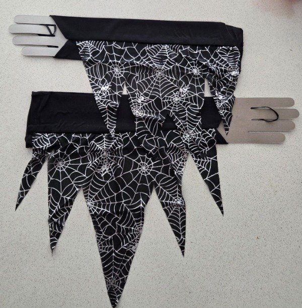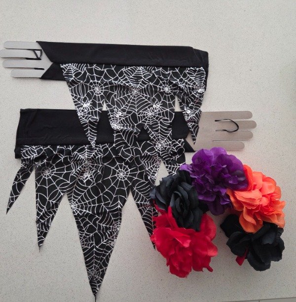 Combo Halloween vincha Frida y guantes negros largos con enganche en el dedo y estampa telaraña en color plata